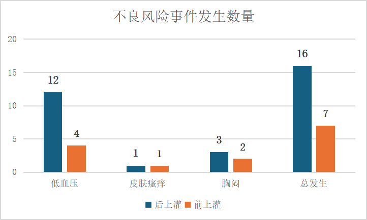 有研究結果顯示,后上灌會增加不良事件發(fā)生率(見圖3),作者猜測可能是透析治療2h后血容量減少,再行HP治療時由于血容量相對較低,可能導致濾器凝血,易誘發(fā)機體低血壓,增加不良事件的發(fā)生。因此,從患者治療安全角度考慮,應該選擇前上灌。